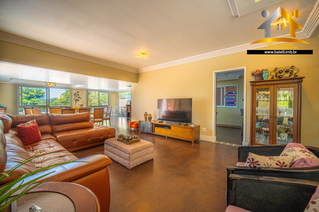 A área social conta com sala de estar com lareira, sala de jantar e sala de TV integradas, formando um ambiente iluminado e funcional.