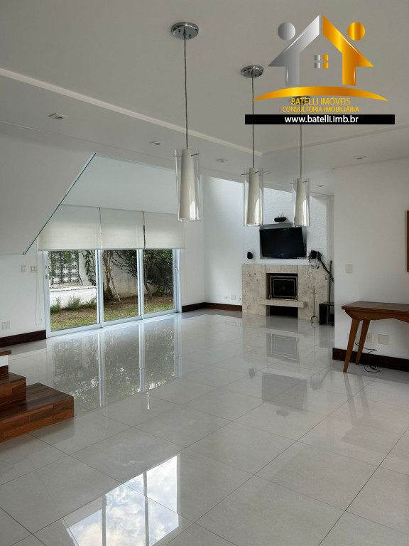 Sala ampla para três ambientes, com pé direito duplo e uma charmosa lareira.