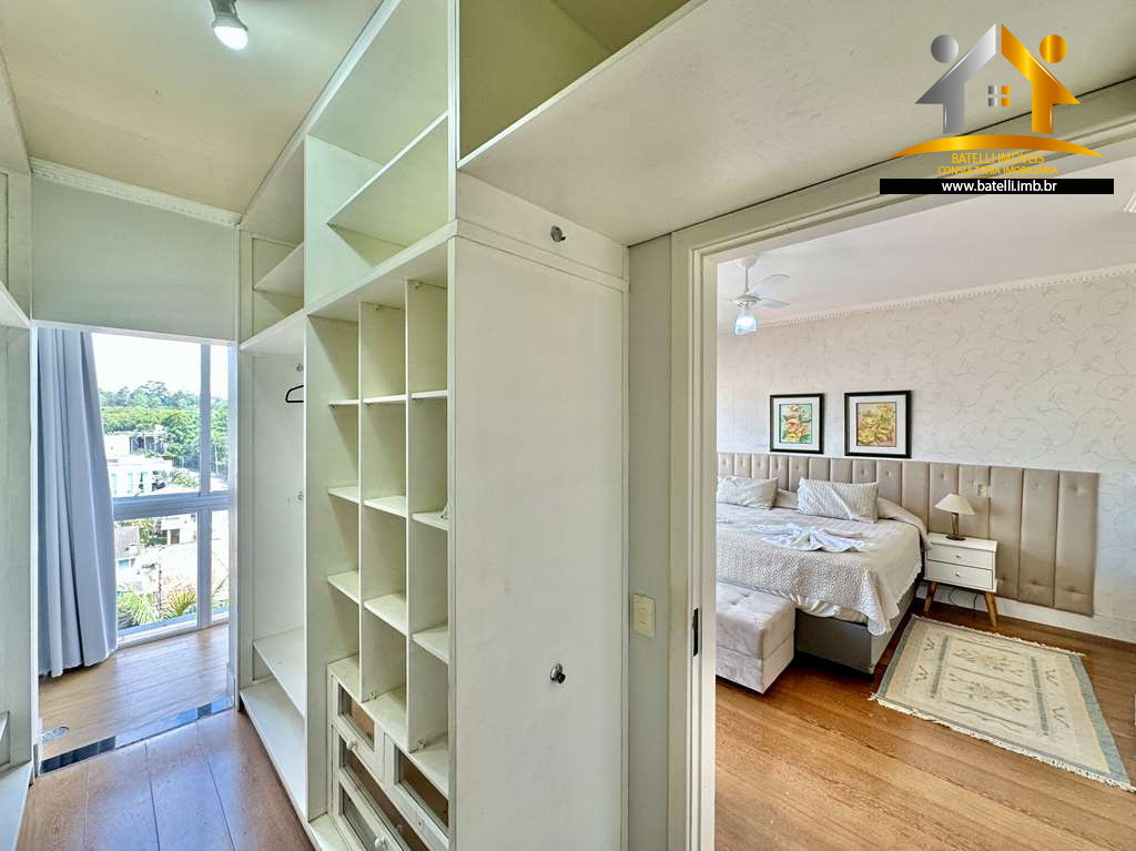 No piso superior temos hall íntimo com roupeiro, 05 suítes com armários, sendo 1 no térreo e 4 suítes no piso superior, sendo 2 americanas com terraço e 2 com paredes de vidro panorâmica e espaço saleta. A master com estantes e Walk-in Closet planejado, 08 banheiros, dos quartos com gabinetes, espelho, bancadas em mármore e box de vidro.