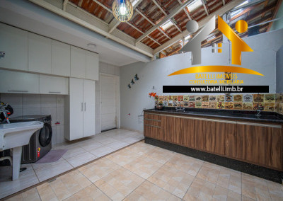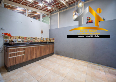 Área gourmet com armários, pia, balcão e espaço para churrasqueira;